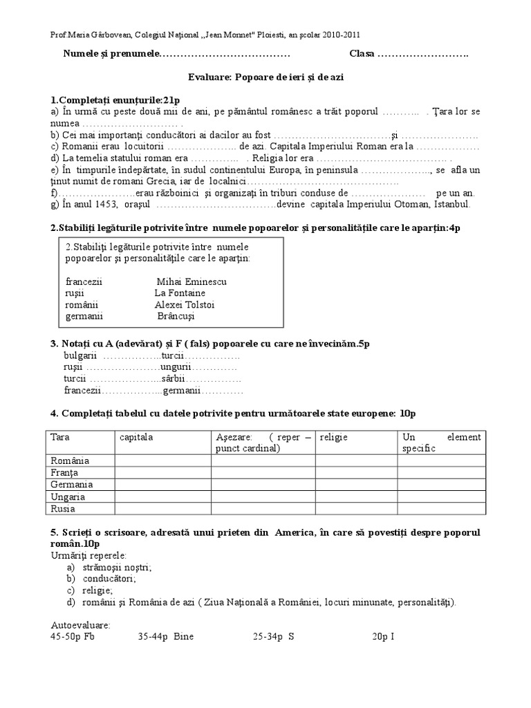 2 Evaluare Istorie Popoare De Ieri Si De Azi