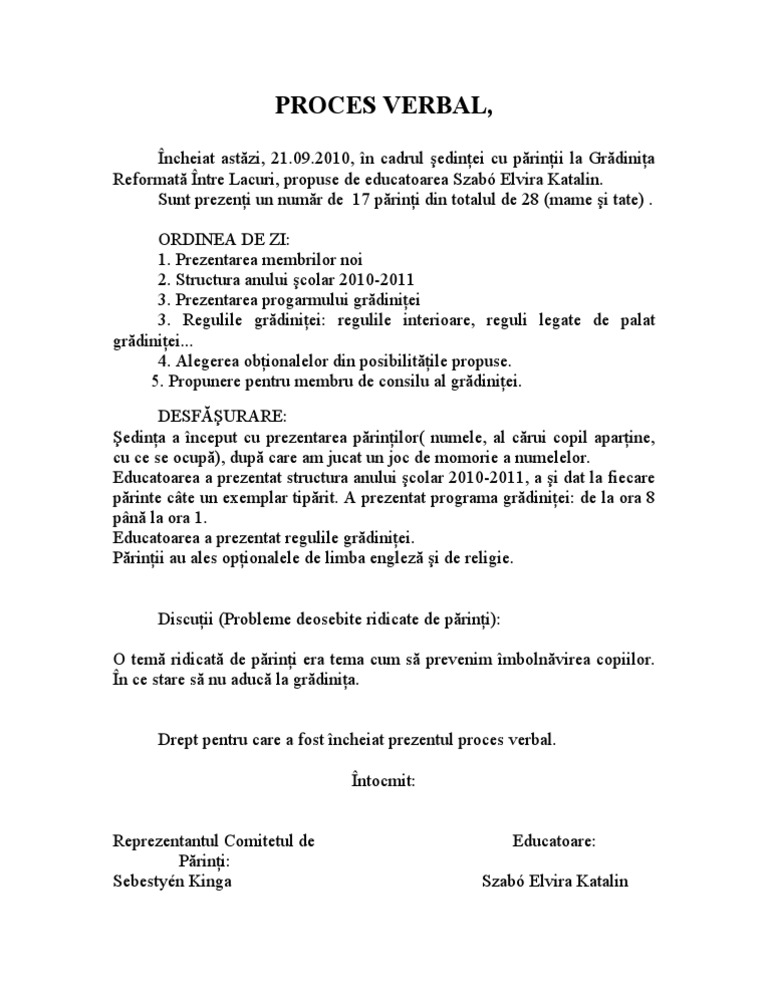 Proces Verbal Sedinta Cu Parintii Situatia La Invatatura Completat