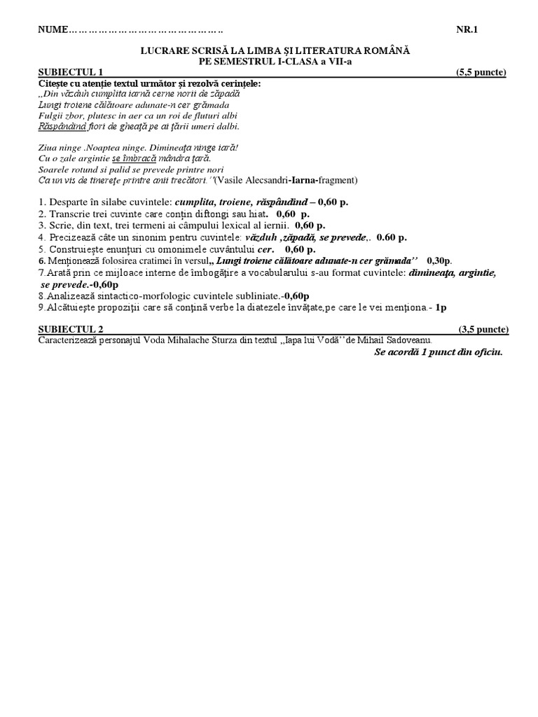 Teza Cu Subiect Unic Pe Semestrul Al Ii Lea Limba Si Literatura Romana Clasa A Vii A