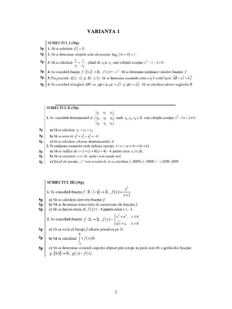 100 De Subiecte De Matematica Pentru Examenul De Bacalaureat Profil M1 Varianta 1
