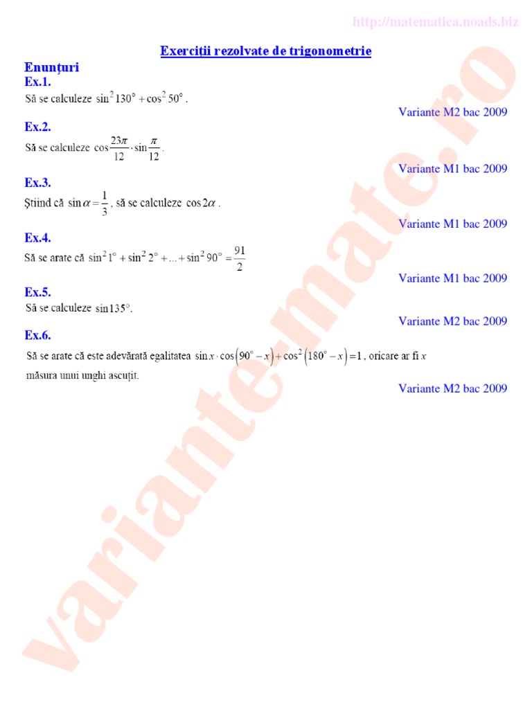 Variante Mate Ro Exerciţii Rezolvate De Trigonometrie Enunţuri